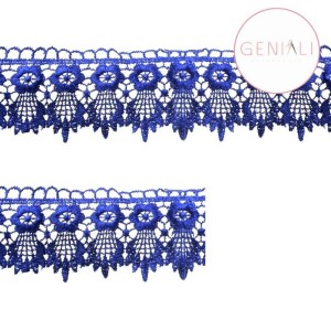 Renda Guipir Azul Royal com acabamento impecável, ideal para aplicações em roupas finas, artesanato e decoração. Perfeita para quem busca sofisticação.